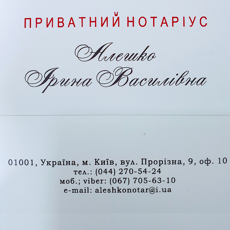 Дякуємо величезному нотаріусу Ірині Альошко за професіоналізм, теплий прийом та незабутню атмосферу, яка панує в офісі на вул. Прорізний, 9, у наймальовничішій частині центру міста Києва. Якщо в мене ще виникне потреба у відвідуванні нотаріуса, я обов'язково вирушу на вул. Прорізну, 9 до нотаріуса Ірині Альошко!